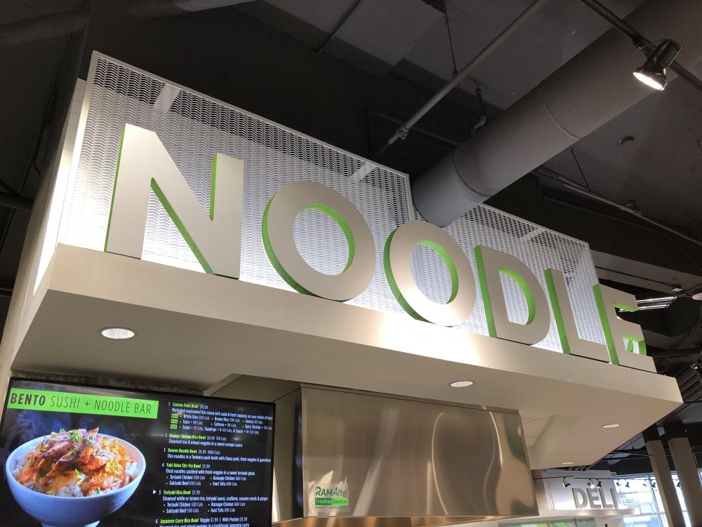 A major grocery store chain recently opened a new urban concept store in the west end of Toronto. Ferrier Wire's Ampliato Aalto pattern material was used extensively as a background for the signage throughout the store.